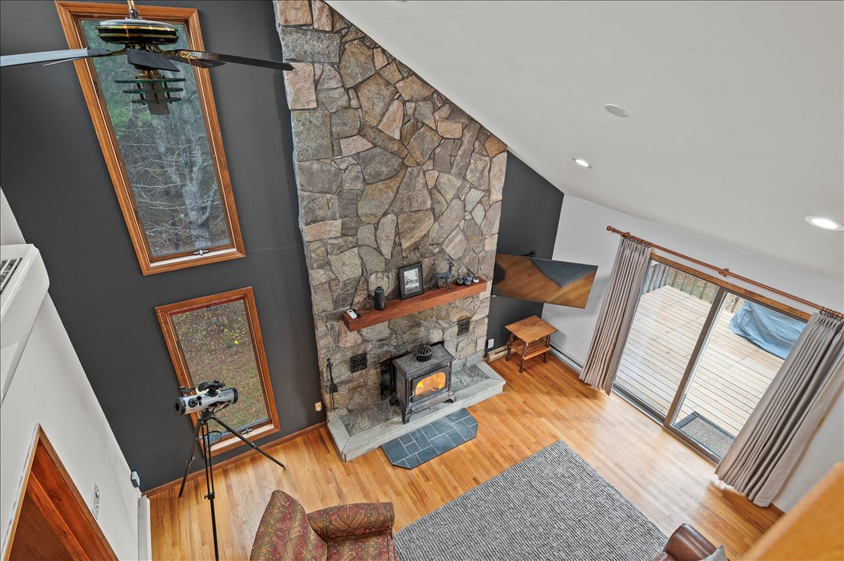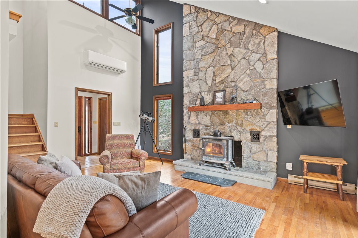 • Spacious living room with vaulted ceilings, Smart TV, and a wood-burning fireplace
